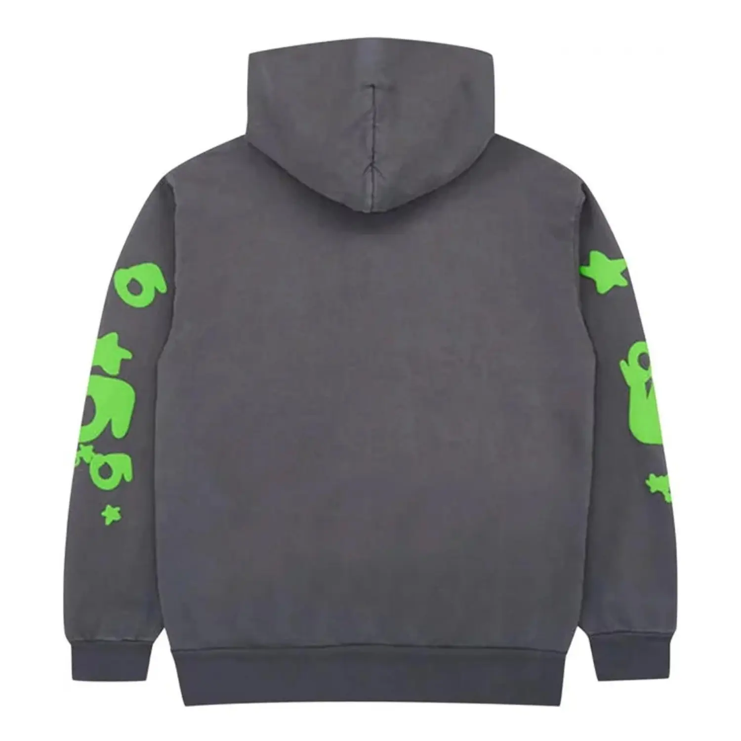 - This hoodie is made from a high-quality blend of materials that ensure both comfort and longevity. The fabric is soft against the skin, making it perfect for all-day wear.The unique grey and green color scheme gives the hoodie a distinctive look, setting it apart from standard monochrome models. The green accents are tastefully applied, providing a subtle yet impactful contrast.Featuring the iconic Sp5der 3D spider graphic on the chest, the hoodie offers a modern and trendy aesthetic. This design is both bold and minimalistic, making it suitable for a variety of fashion styles.Designed for a comfortable fit, the hoodie is neither too tight nor too loose, ensuring versatility for different body types. The ribbed cuffs and hem enhance the fit, keeping the garment in place while moving. Â The adjustable drawstring hood is lined with a soft, breathable material, providing added warmth and protection from the elements without sacrificing comfort.